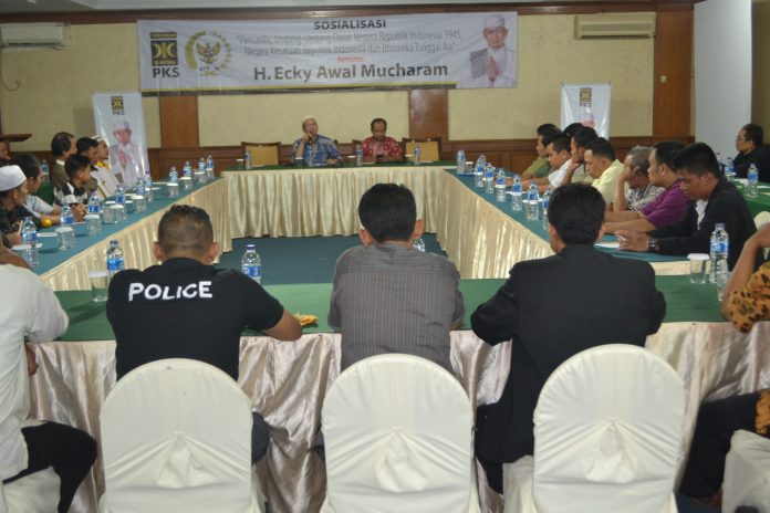 Kota Bogor – Kader dan simpatisan PKS harus menjadi garda terdepan untuk mengamalkan nilai-nilai Pancasila untuk mewujudkan Indonesia yang adil dan sejahtera. “Pancasila merupakan ideologi negara dan falsafah perjuangan PKS. Dengan mengamalkan nilai-nilai Pancasila, kita juga dapat ikut membentengi moralitas bangsa, menjaga toleransi antar elemen masyarakat, dan meningkatkan ketakwaan kepada Tuhan YME.” jelas anggota DPR MPR RI dari Dapil Kota Bogor-Cianjur Ecky Awal Muharram saat Sosialisasi Empat Pilar Kehidupan Berbangsa dan Bernegara di Hotel Pangrango 1 akhir pekan lalu. (13/03).