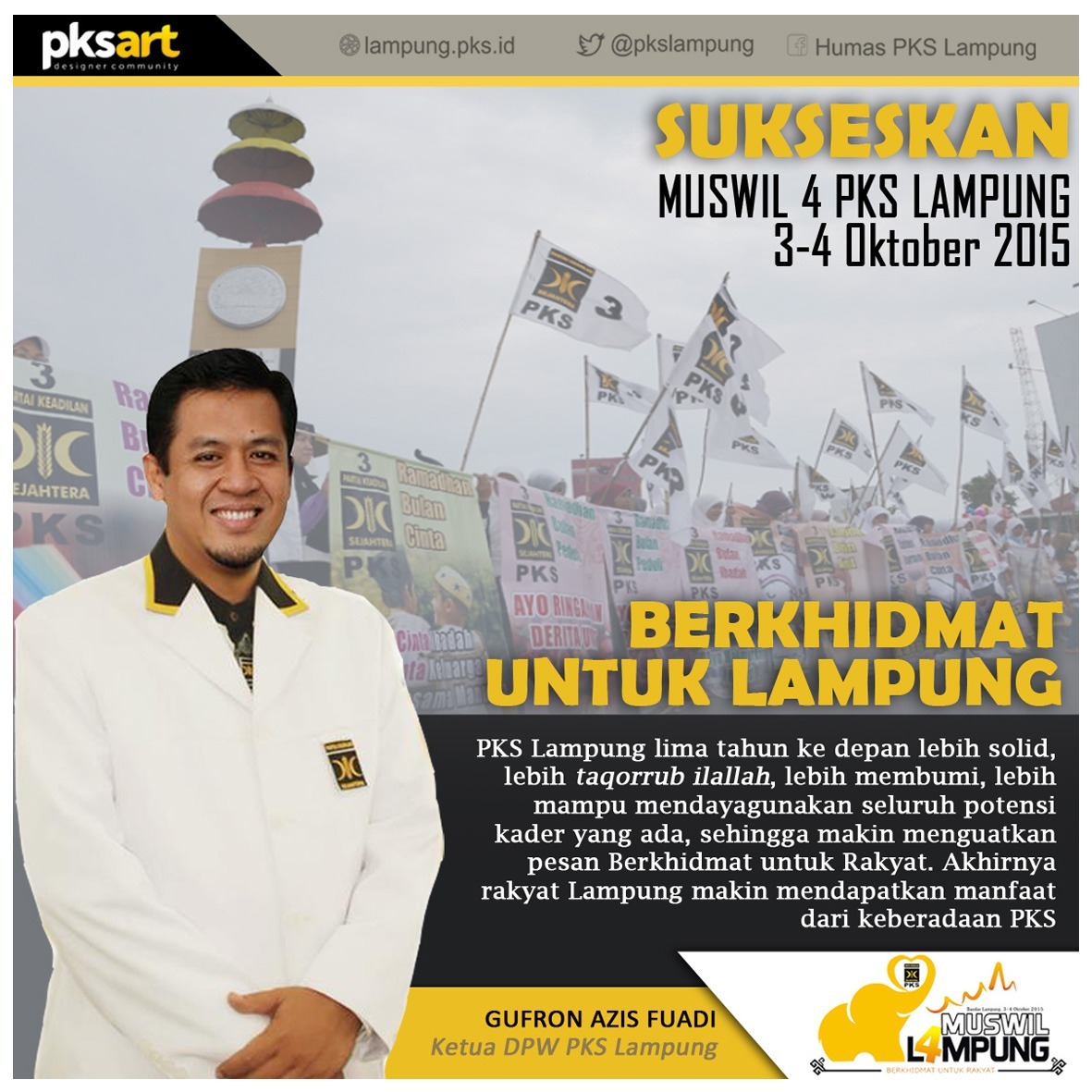 Musyawarah Majelis Syura dan munas sudah selesai digelar, kini giliran PKS Lampung pada 3—4 September 2015 menggelar Musyawarah Wilayah (Muswil). Muswil menandai berakhirnya kepengurusan PKS Lampung periode 2010—2015. Saya menulis ini sebab kepengurusan saya segera berakhir dan PKS Lampung segera memilih kepengurusan baru periode 2015—2020.