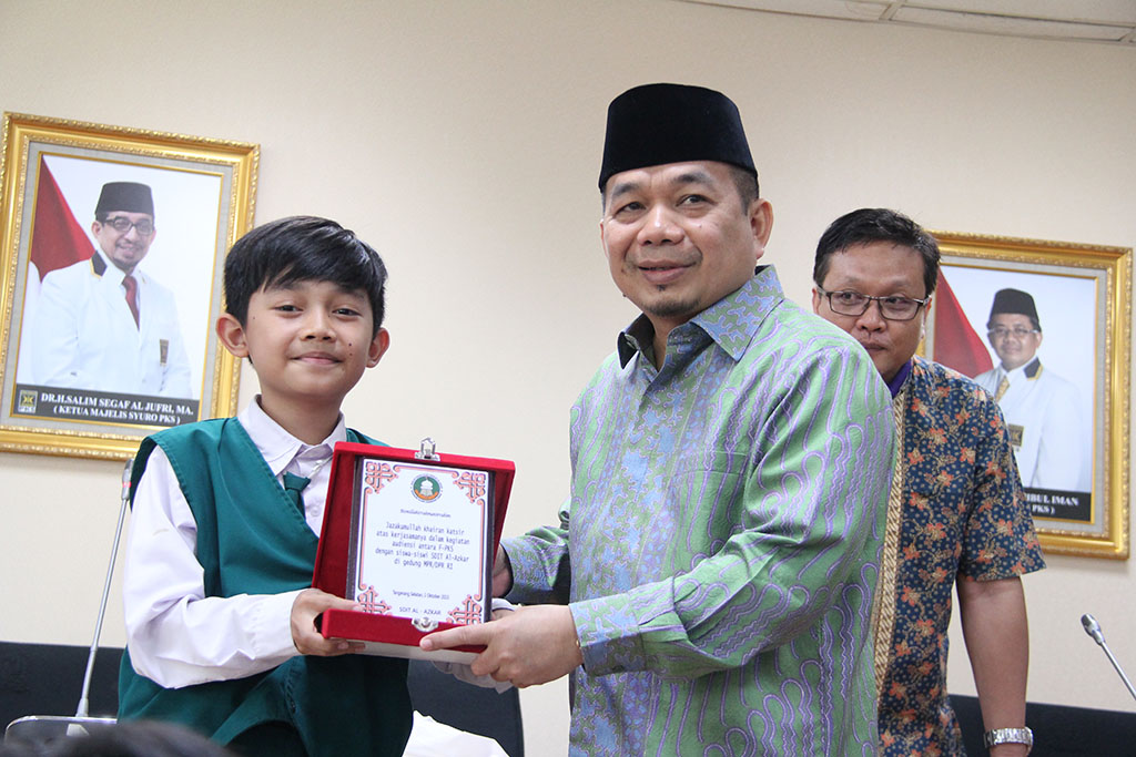 Jakarta (1/10) – Fraksi Partai Keadilan Sejahtera (PKS) DPR RI menerima kunjungan dari Sekolah Dasar Islam Terpadu (SDIT) Al-Adzkar, Pamulang, Tangerang Selatan dan SDIT Gema Nurani, Bekasi, Jawa Barat di ruang rapat pleno Fraksi PKS Gedung Nusantara I, Kompleks Parlemen Senayan Jakarta, Kamis (1/10). Acara seperti ini dilakukan Fraksi PKS untuk memberikan pendidikan politik sejak dini kepada generasi penerus bangsa. Ketua Fraksi PKS DPR RI Jazuli Juwaini dan Anggota Komisi X DPR RI dari Fraksi PKS, Nurhasan Zaidi menyambut kehadiran para siswa yang datang mengunjungi Fraksi PKS.